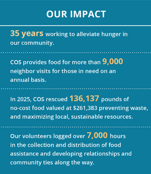 For 35 years, Community Outreach Services (COS) has taken seriously our responsibility to support our neighbors in times of need through our three programs – food, fuel, and essential needs.