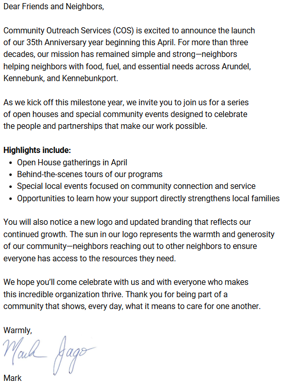 *Donation Checks can be made payable to COS or Community Outreach Services